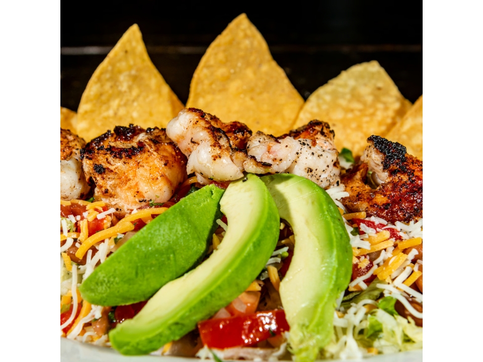 shredded lettuce topped with whole beans, grilled tiger prawns, pico de gallo, cheese & avocado